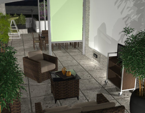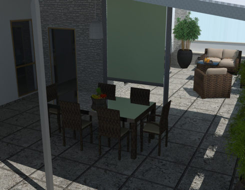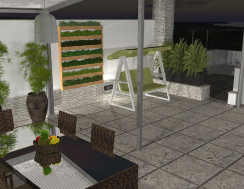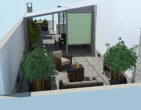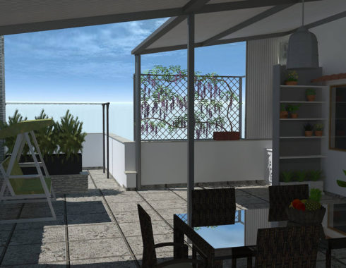 Parte dello spazio è coperto da strutture leggere ma idonee a riparare il tavolo dal sole, mentre il resto del terrazzo è destinato all’utilizzo serale, con la presenza di un salottino con mobile tv. La zona lavanderia è coperta da una parete divisoria in metallo zincato e, separato da un muretto basso, troviamo lo spazio adibito a stendere i panni.