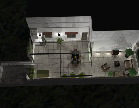 Il perimetro esterno del terrazzo è illuminato da luci soffuse poste a mezzo metro dal pavimento, la zona pranzo invece prevede applique sui muri e un lampadario al centro del tavolo.