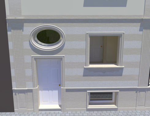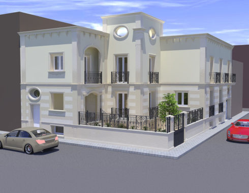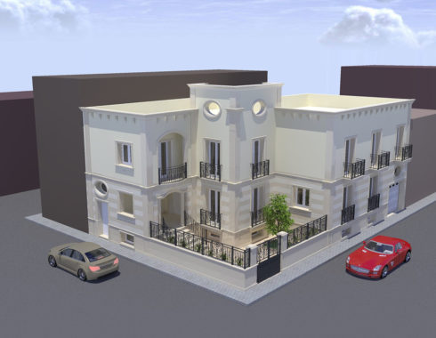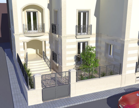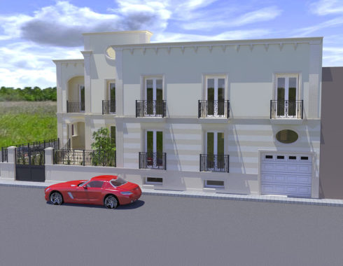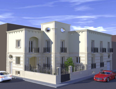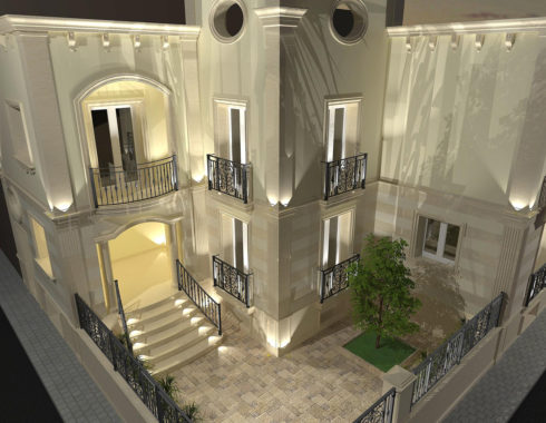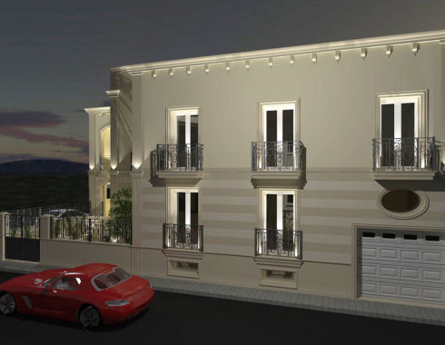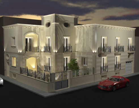 Presentiamo lo studio di un’abitazione ad angolo composta da due piani con torretta centrale. Il rivestimento nella parte inferiore è caratterizzato da una boiserie che si ripete su tutto il perimetro, e da fasce di travertino lavorato in modo differente, determinando così l’alternanza di colori e finiture. Porte e finestre prevedono cornici importanti, come lo sono le lesene e i capitelli che decorano gli angoli. Il cornicione superiore è impreziosito da mensole in tufo, il tutto irradiato da spotlight inseriti in modo strategico, garantendo così la perfetta illuminazione del cortile interno, delle scale e di entrambi i prospetti.