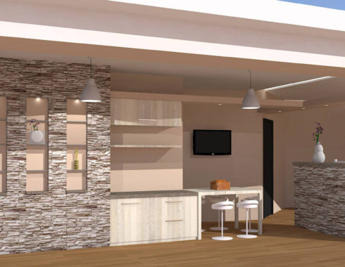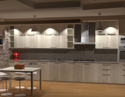 Studiando una scalettatura nel controsoffitto si vanno ad illuminare i punti di forza nell’arredo, dove gli stessi materiali si fondono armonicamente: la quarzite più ruvida e porosa si sposa perfettamente alla Fragranite scelta per il top e come rivestimento della zona cottura.