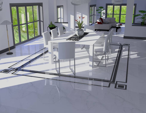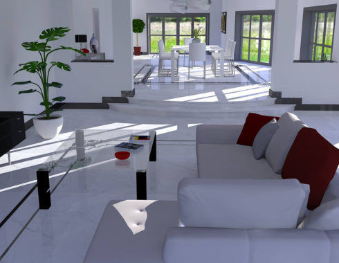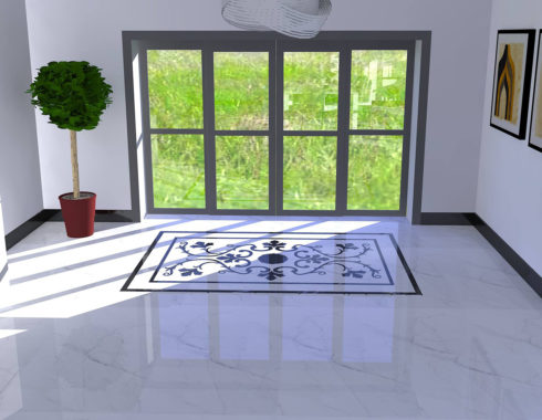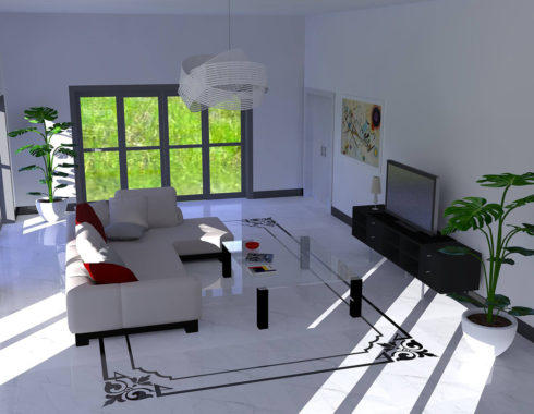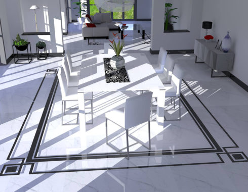 Rispecchia i canoni del “less is more” questo appartamento di Lagos, Nigeria. Linee e colori essenziali valorizzati da un pavimento in Pirgon White con preziosi intarsi in marmo Nero Marquina. I decori si sviluppano intorno alla zona salotto e delimitano il tavolo da pranzo; davanti all’ingresso principale e alla porta scorrevole che introduce in veranda, trovano posto tappeti ornamentali di sobria eleganza.